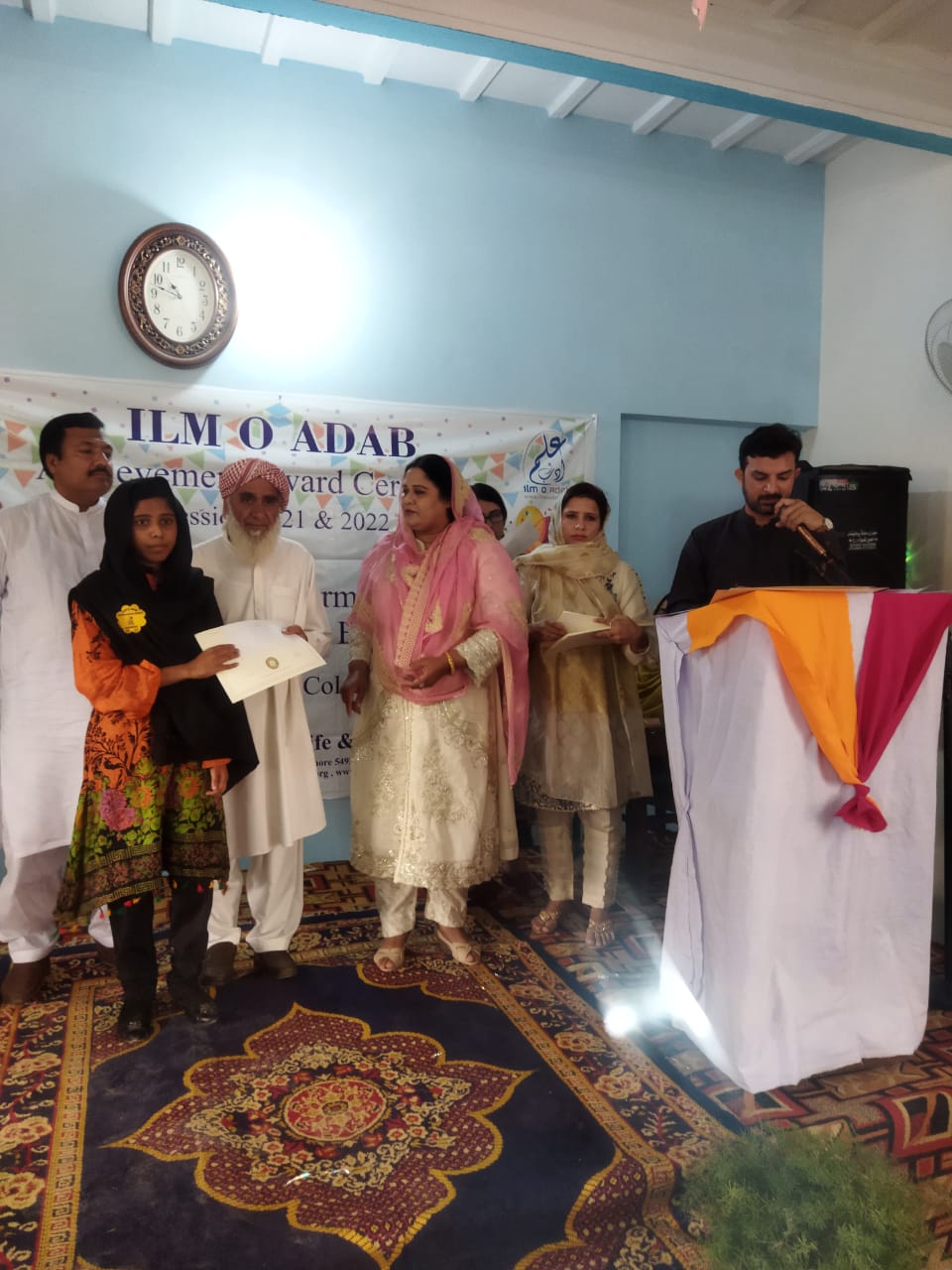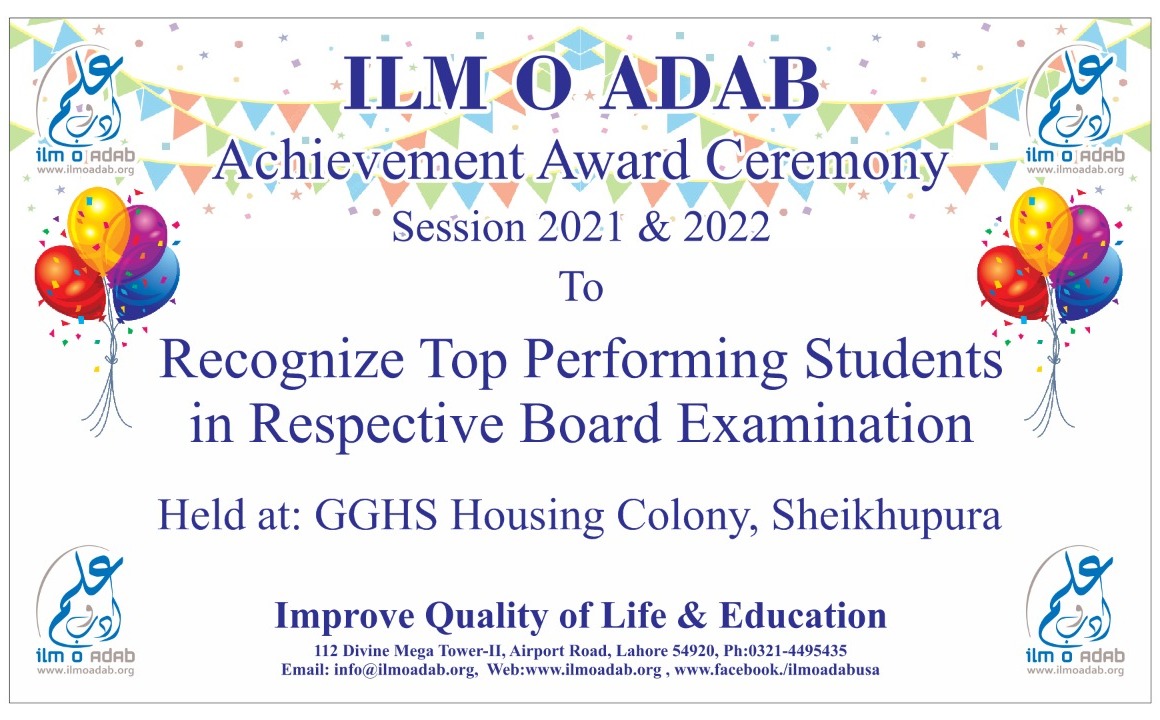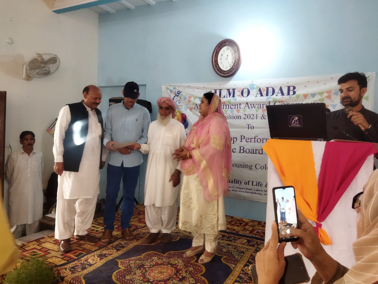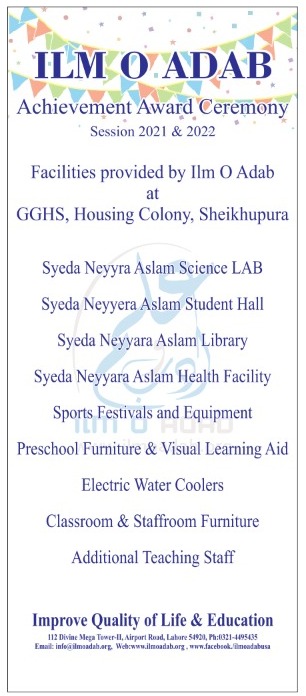 Ilm o Adab 9th Annual Performance Award ceremony 2021-22 held @ Govt. Girls High School, Housing Colony, Sheikhupura. Top performing students were awarded cash prizes, certificates and laureate badges.