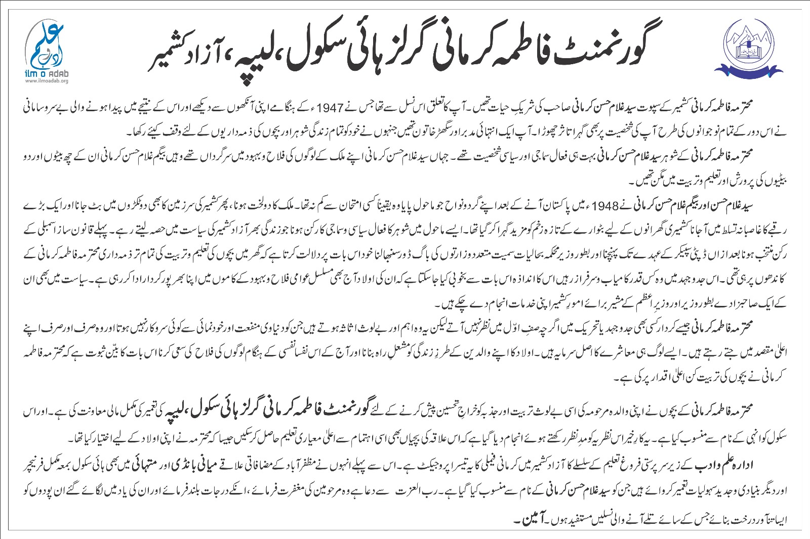 Ilm O Adab Build and furnished Govt. Fatima Kirmani Girls High School, leepa, Azad Kashmir. Project was sponsored by individual philanthropist.